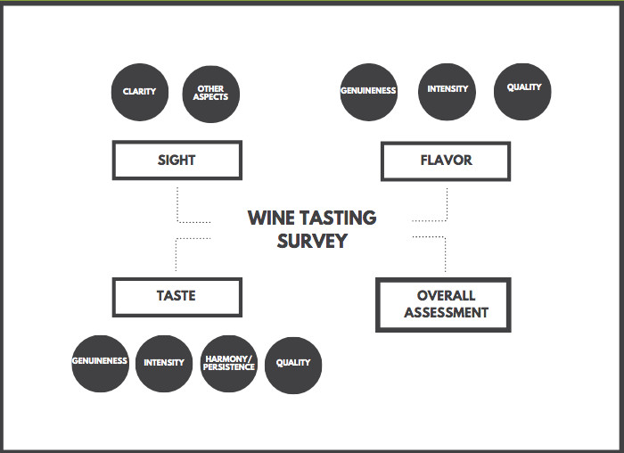 | How it Works | The survey allows the tasters to evaluate the wine they have just tasted according to three sets of assessment factors: Sight, Flavour, and Taste. Each of these includes more specific aspects. Moreover, while all the 10 evaluation criteria have the same qualitative scale - ranging from Weak to Very Good/Excellent -, each of them has a different weighting. The final grade of a wine varies between 50 and 100 points. An additional evaluation criterion under analysis is the price-quality ratio of each wine. |